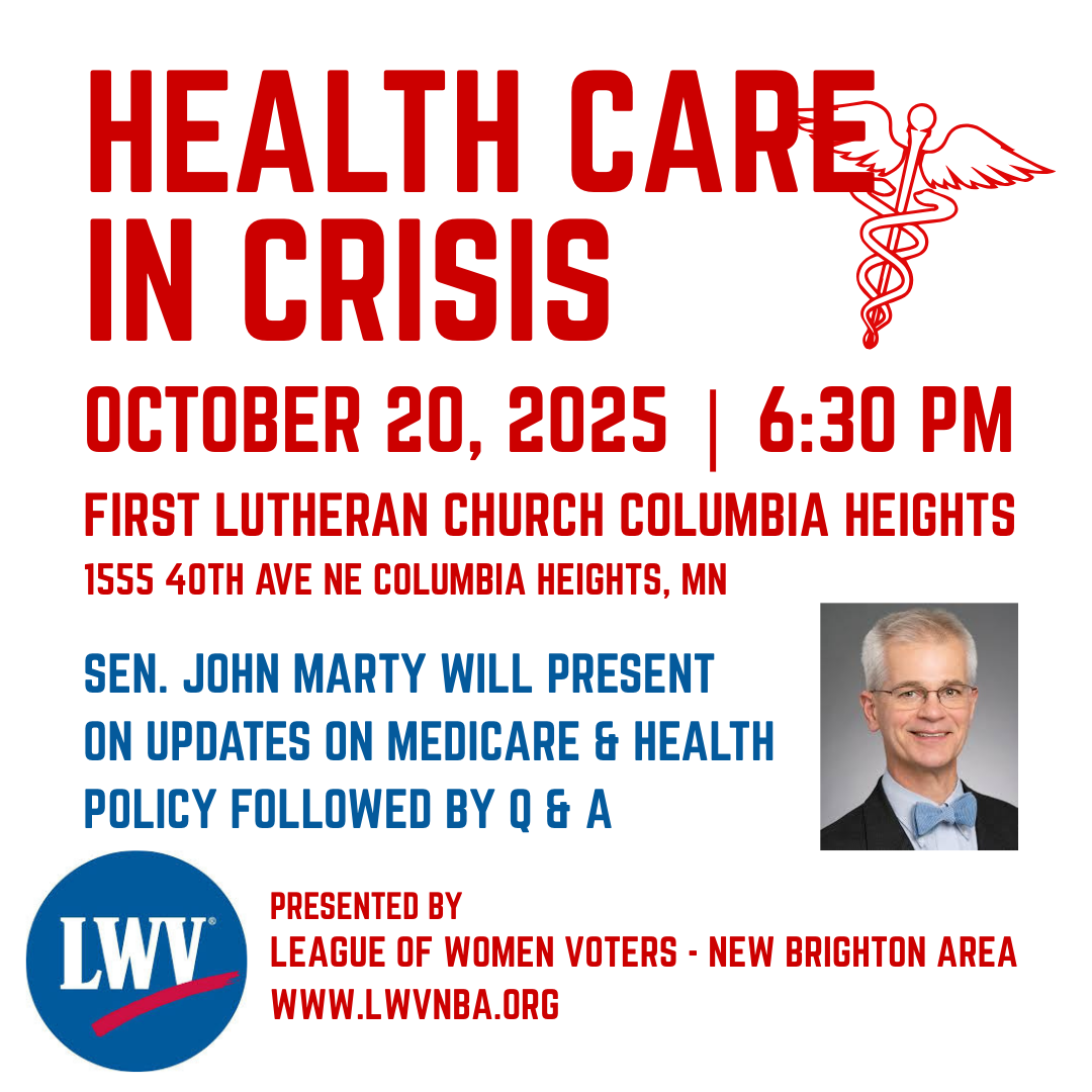 Senator John Marty will present on updates to Medicare and Health Policy. It will be followed by Q & A. Presented by New Brighton Area LWV ~ lwvnba.org