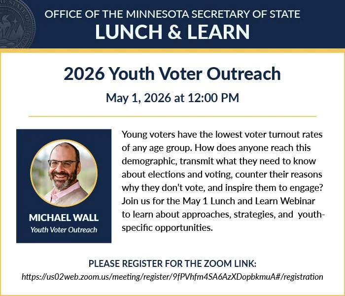 Young voters have the lowest voter turnout rates of any age group. How does anyone reach this demographic, transmit what they need to know about elections and voting, counter their reasons why they don’t vote, and inspire them to engage? Join us for the May 1 Lunch and Learn Webinar to learn about approaches, strategies, and youth-specific opportunities.